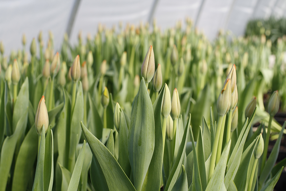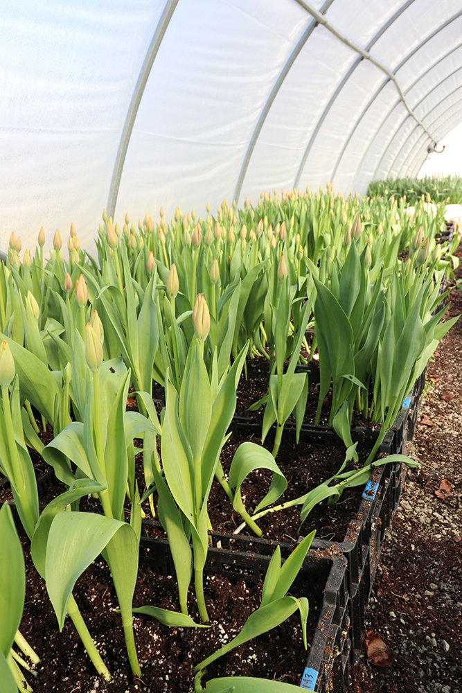 First we poked our heads into a shed, where Mark was cleaning the dirt off cut tulips and bundling them in groups of ten. Normally he’d work in a greenhouse, but this year it was warm enough to work outside. Leah showed us a cooler with crates of bulbs and explained the process they use to control the tulips: the bulbs spend time in the cooler, then are planted in crates of dirt in one of the greenhouses. How long they take to grow depends on the variety, the timing of the cooling and planting process, and the weather. She and Mark stagger plantings based on the orders they have and on last year’s sales. When the flowers form but are still tightly closed, they pull the whole bulb out; only the first flower is used because it is the highest quality, and the bulb is composted.