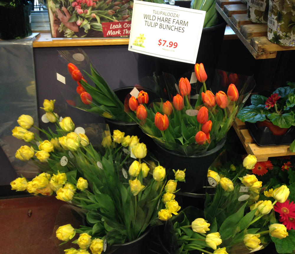 In late February 2017, we drove out to visit Leah Cook and Mark Thomas at Wild Hare Farm in Cedar Grove. At the time, the tulips were just beginning to bloom. By March, they were flowering in abundance. That’s why we celebrate Tulipalooza, a week with tulip bunches on sale! (2020 update: Tulipalooza begins March 18 with bunches for $7.99.)