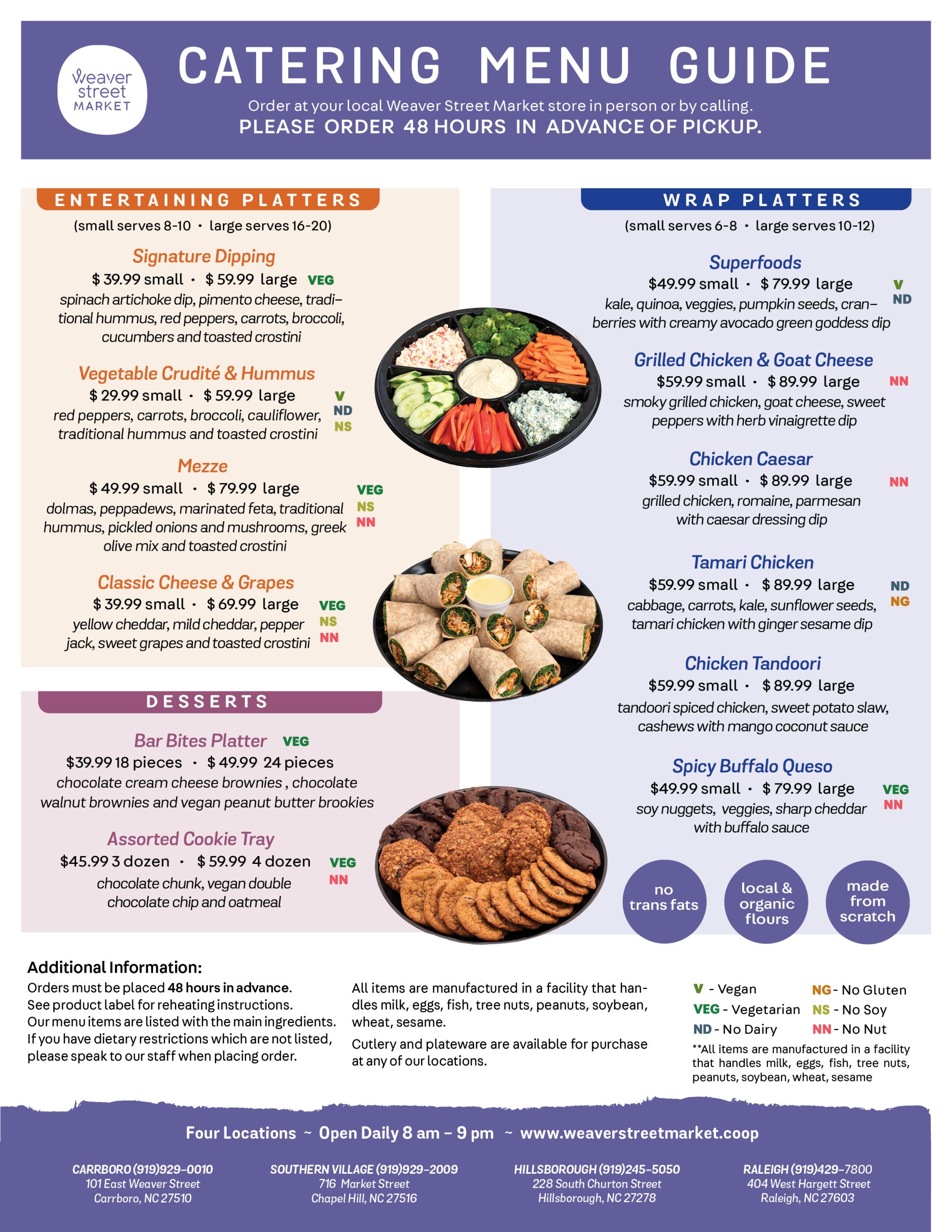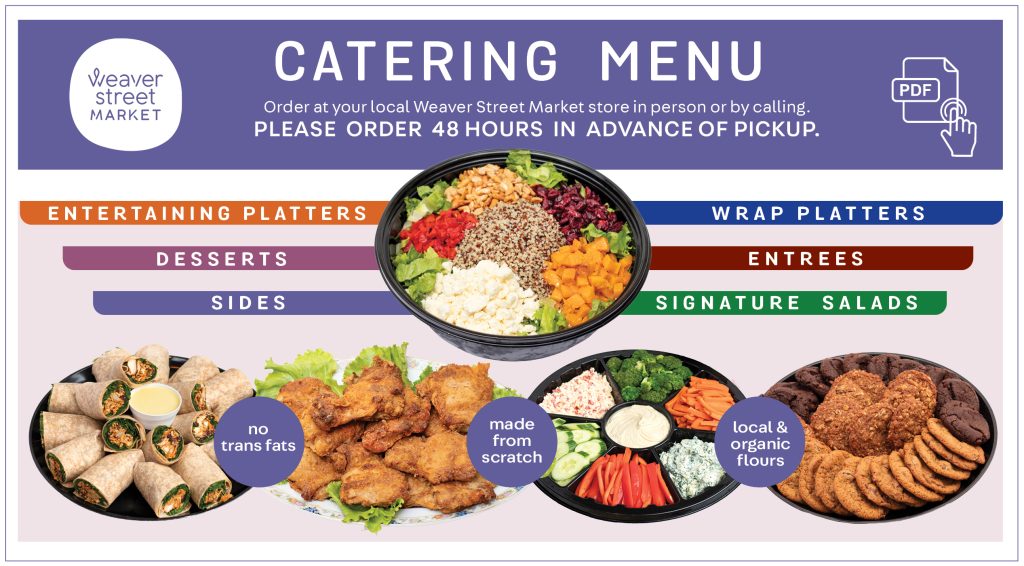 Perfect for your family events, office lunches or upcoming celebrations–made with the same local flavors you love. Click on the image or here to see the full PDF of our offerings. To order, call or stop by your favorite Weaver Street Market location.