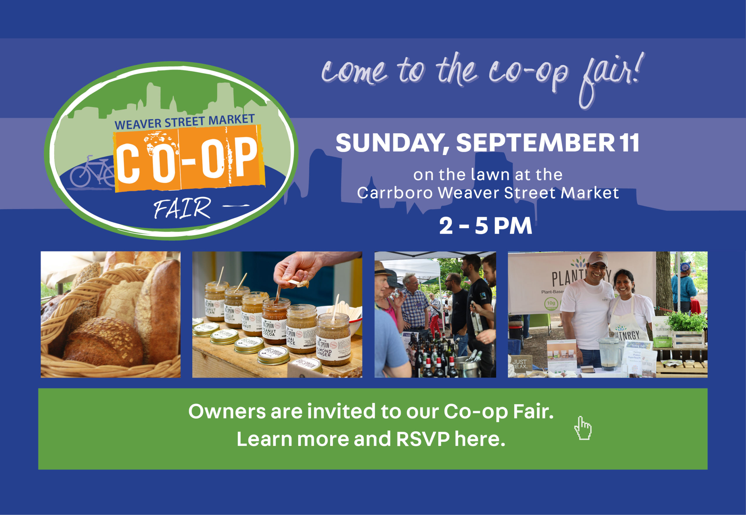 You can also chat with members of our Board of directors as well as the Board candidate running in the 2022 board election. Visit with winners of the 2022 Cooperative Community Fund grants, and learn updates about the Community Food Partnership and the impact of the Round Up! program. Learn about Weaver Street’s reusable packaging initiative, and enter the raffles for local, game changer, and co-op produced products. Click here to RSVP.