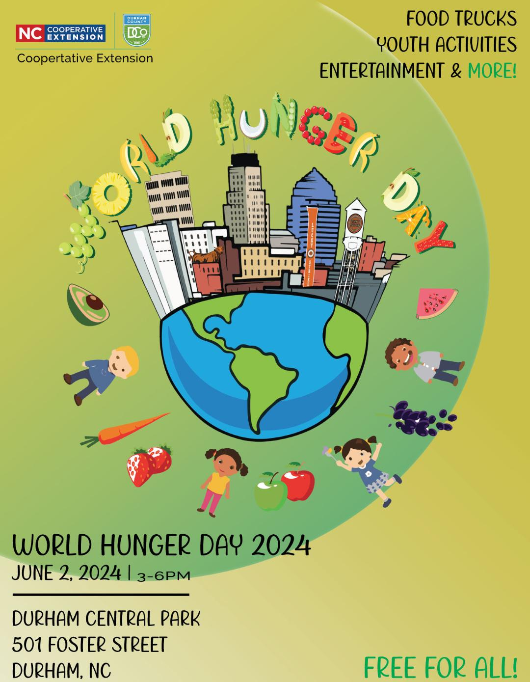 NC Cooperative Extension and Durham County are partnering to celebrate World Hunger Day 2024 on June 2nd. Come enjoy and have fun!