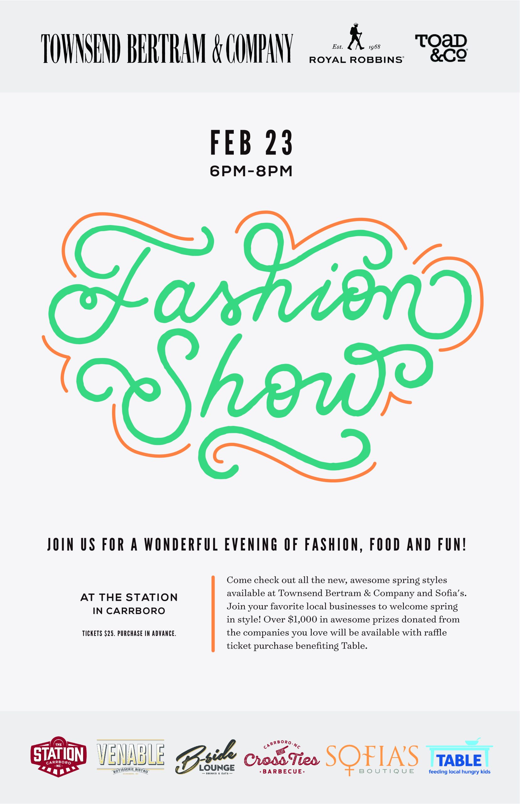 A fashion show with a raffle to benefit TABLE. Tickets: https://www.tablenc.org/httpswwweventbritecomespring-into-style-carrboros-fashion-show-tickets-31456220402