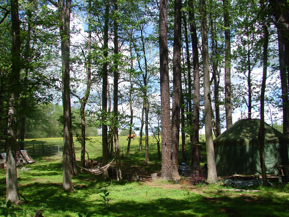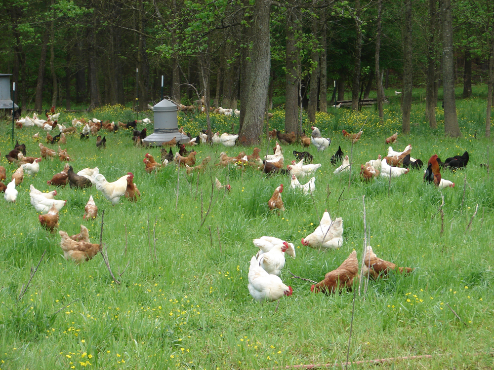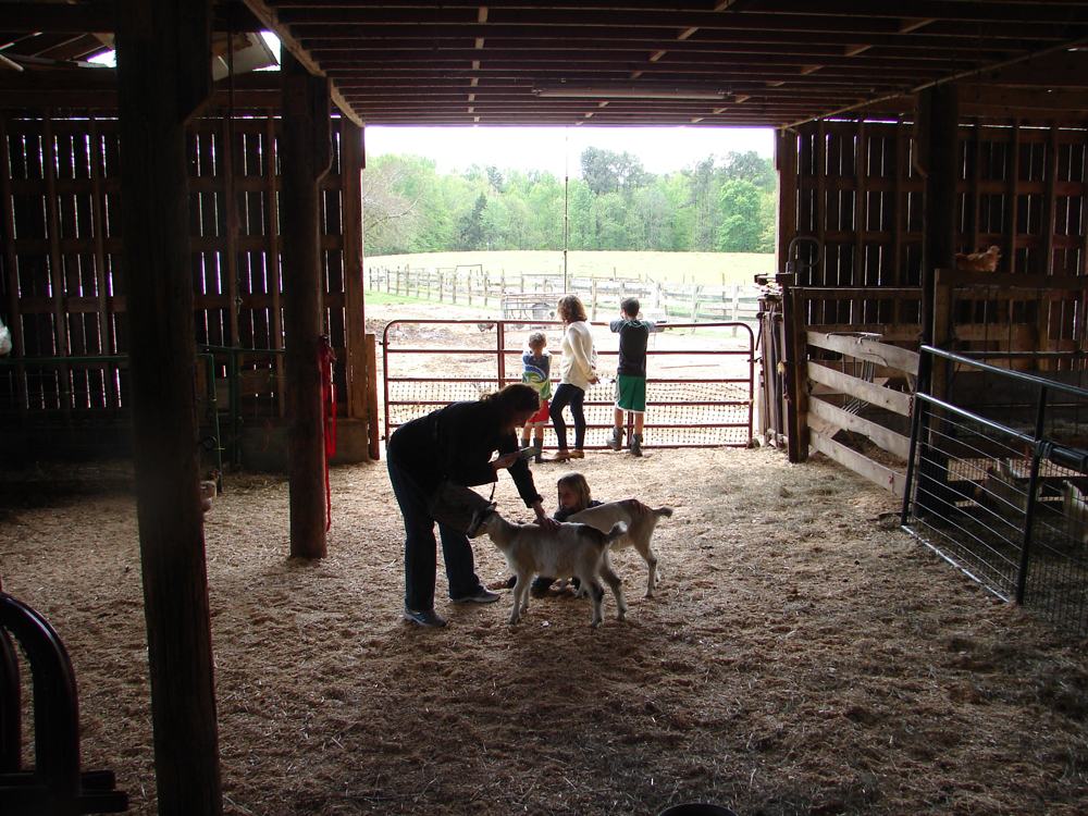 I managed to visit four farms on this year’s Piedmont Farm Tour. On Saturday, my sister (visiting from Boston) had requested that we see “lots of animals,” so we headed first to Woodcrest Farm. In the barn, we could pet baby goats (the chickens scurried away), and outside, we saw gigantic bunnies, doves, and the farm’s herding dogs, as well as the greenhouse. The Greens, who own Woodcrest, had prepared a guided tour of the land that led past the goats and the farm pond and into the woods, with interpretive signs. We returned to the entrance across the wide field with the cows.