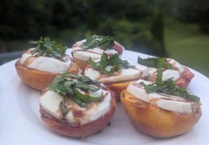 - While the peaches are still warm, top each with a thin slice of mozzarella.