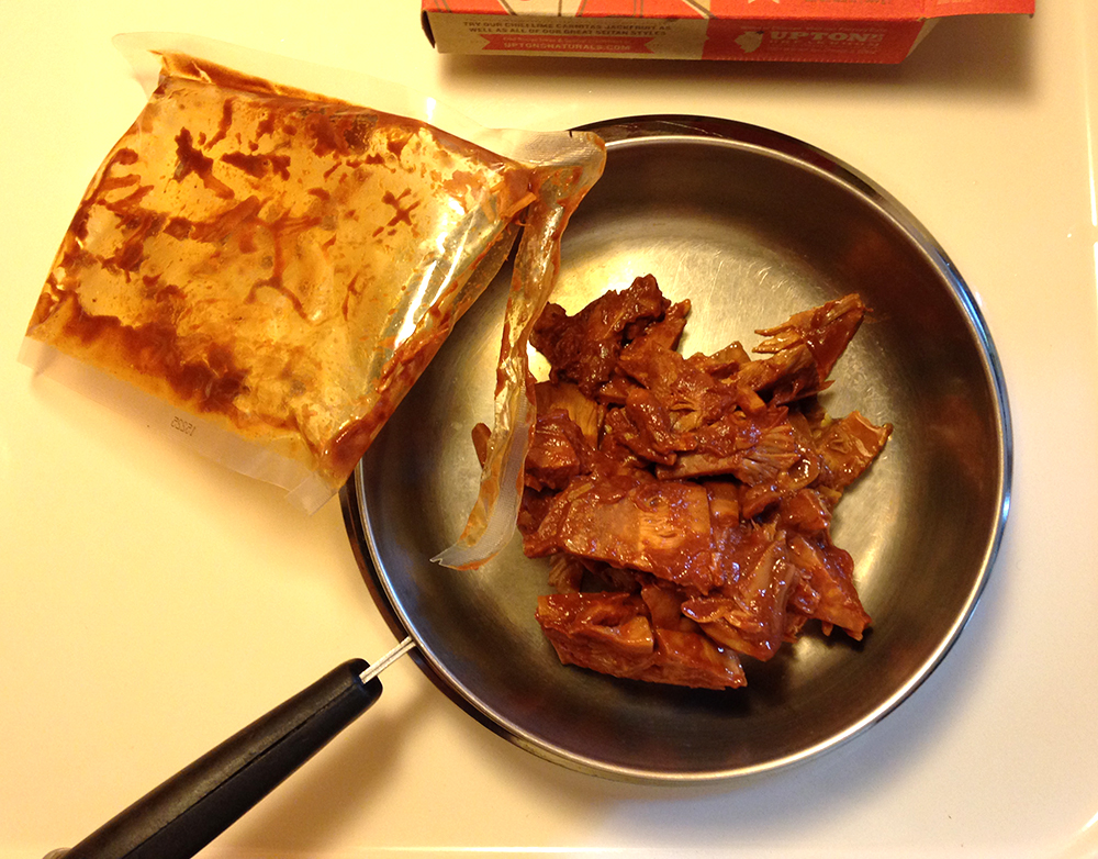 The jackfruit was already seasoned with barbecue sauce. I basically had to open the bag, pour it into a pan, and heat it for two minutes. It was simple. And it was good! It tasted like barbecue sauce. (It was a little on the spicy, vinegary side.) The fruit had the consistency of artichoke hearts; it was smoother than expected, not tough or chewy at all.