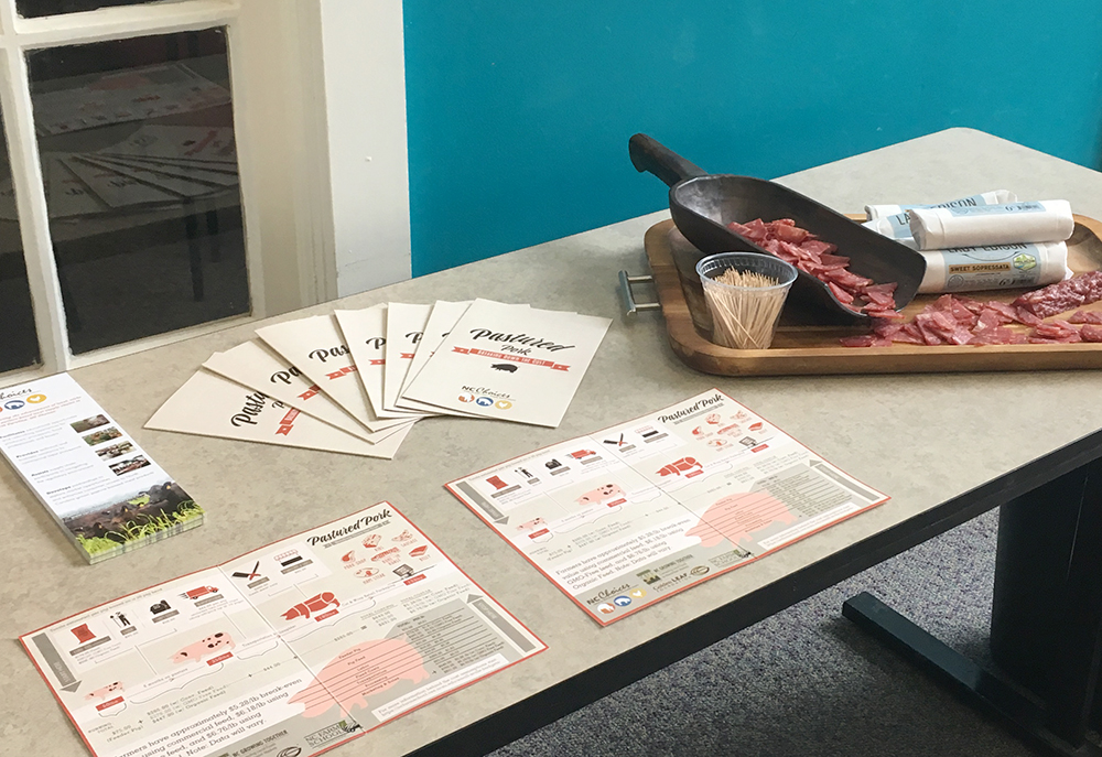 This February I had the pleasure of organizing a training for Weaver Street Market staff on our local pasture-raised pork products. We had a great turnout of attendees and a wonderful group of speakers: Sam Suchoff of The Pig restaurant and Lady Edison Meats; Jeremiah Jones, hog farmer and president of the NC Natural Hog Growers Association; Emily Moose from A Greener World (the certifying agent for Animal Welfare Approved); and Sarah Blacklin and Sheila Neal from NC Choices.