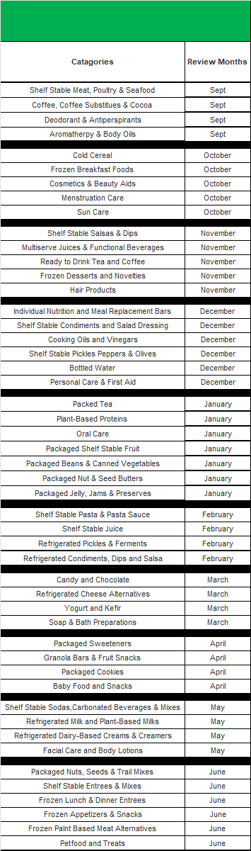 PLEASE NOTE: Please see the list below to determine when we will plan to review your products. You can submit your request at any point – but we will review and consider them for inclusion in our stores based on the following calendar (click to enlarge):