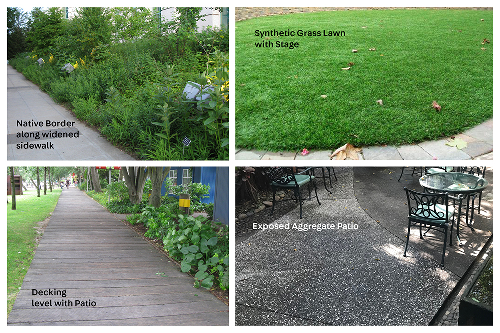 - A patio where the outdoor tables are now, along with wooden decking around the trees (at the same height as the patio) to protect the trees while still allowing dining under the canopy