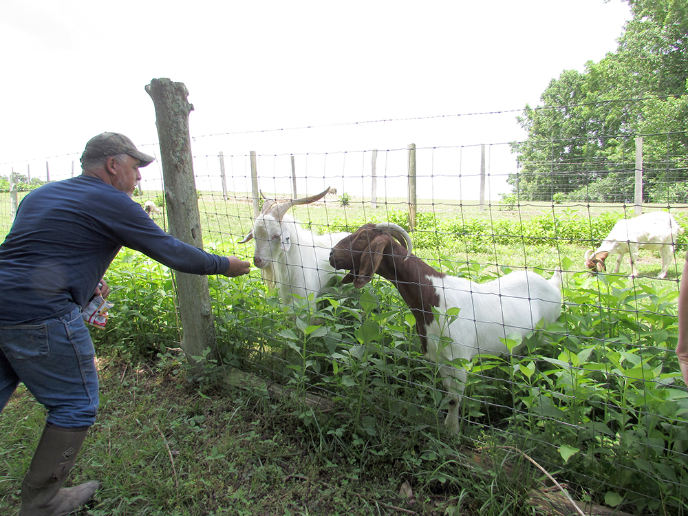 Our first stop was George Hill Farm, where Kent and Deborah Williamson raise some of the chickens whose eggs we sell. Outside the henhouse, hens and roosters pecked at insects in the grass and climbed over the stumps littering an overgrown hillside. Some of them followed us during our tour. Goats, sheep, and donkeys grazed in a pasture. Kent’s grandpa bought the land in 1953 to farm tobacco, and Kent was born there. He left for school but returned in 1999 and began reworking the farm. He now has 155 acres, plus 80 that he rents, for the chickens and cattle, sheep, and goats for meat, as well as hogs that he sells to his cousin’s barbecue joint. Debra also has a pet peacock, because “Beauty is a part of farming.”