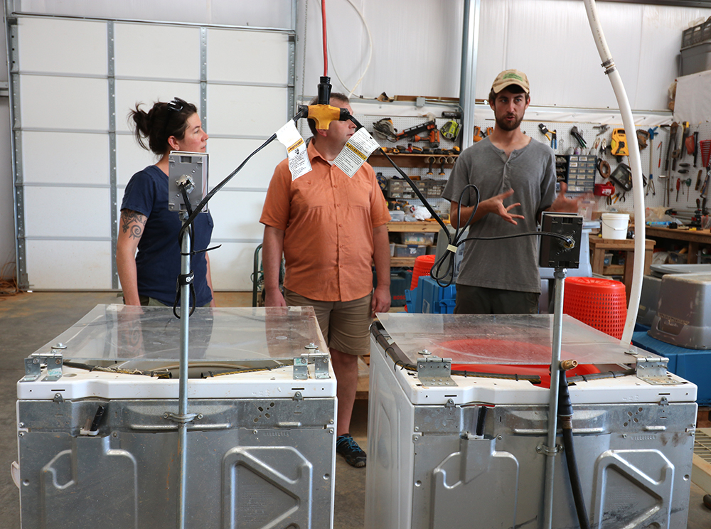To keep weeds back, Brett uses a tilling method to disrupt the weed seeds. The special tiller swirls the soil horizontally without digging too deep, which benefits the health of the soil. In the packing barn, we saw a harvester that is pushed down the rows, with blades on the bottom to cut the greens. We also saw hand-held versions that were used before the farm acquired the rolling model. Brett purchased two new washing machines and modified them as giant salad spinners.