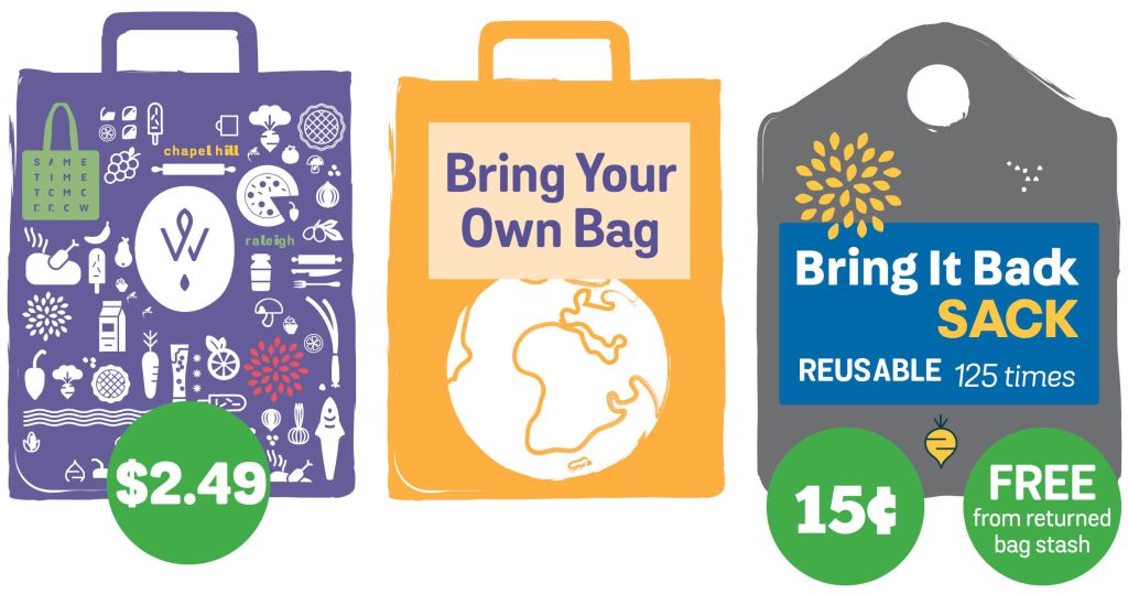 Customers who do not carry their own bag have the option to purchase a reusable “Weaver Bag” for $2.49 or an insulated bag for $3.99, or to use a “Bring it Back Sack” made of heavy-duty recycled plastic sturdy enough to be re-used up to 125 times. New sacks can be purchased for 15 cents, or customers can pick up a free sack from a stash of returned bags.
