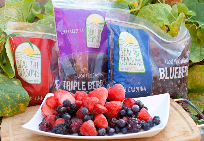Seal the Seasons is an innovative local company that freezes North Carolina fruits and vegetables, so that we can “Eat local all year round.” They work with several small- and medium-sized farm in the state, and process the produce at PFAP in Hillsborough. They freeze the produce as quickly as possible after harvest to preserve the nutrients and flavor.